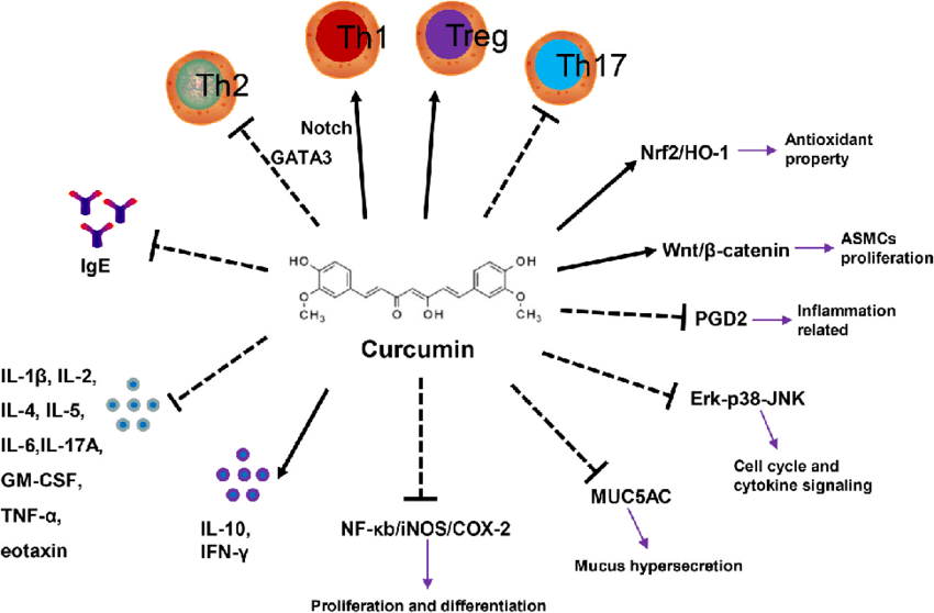 Modulating Immune Responses: Curcumin has been shown in some studies to help rebalance the immune system. In animal models of asthma and allergic rhinitis, it can reduce the activity of "allergy-promoting" T helper cells (Th2) while promoting the activity of regulatory T cells (Tregs), which are crucial for controlling allergic inflammation.
