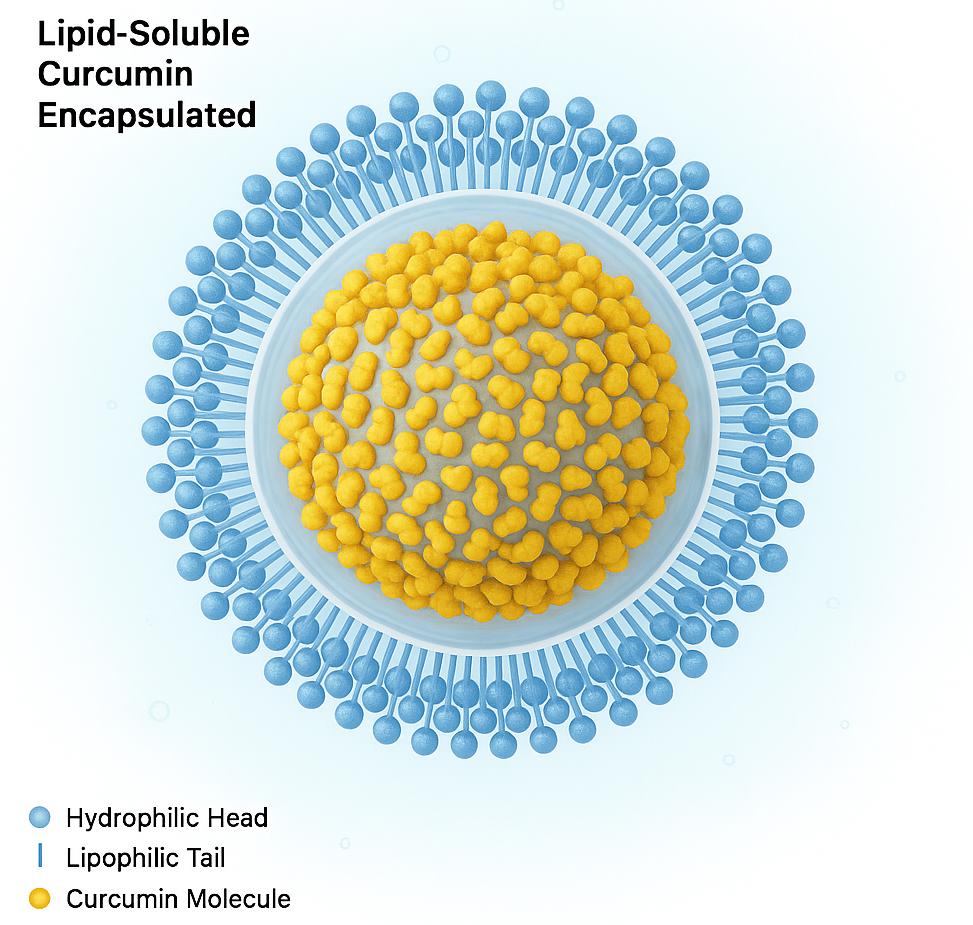 Micellar formulations of curcumin overcome these issues by using a tiny, water-soluble sphere called a micelle. The micelle has a fatty core that encapsulates the lipid-soluble curcumin and a hydrophilic (water-loving) shell, allowing it to bypass the challenges of poor solubility and rapid metabolism.